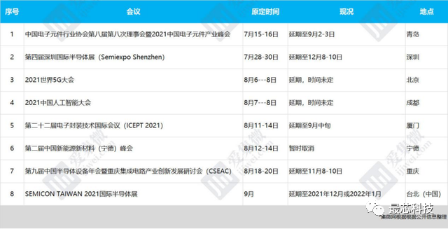 据不完全统计,截止目前已有8场八月或九月举办的涉及集成电路、5G、人工智能、新能源材料等会议或展览宣布延期或取消:
