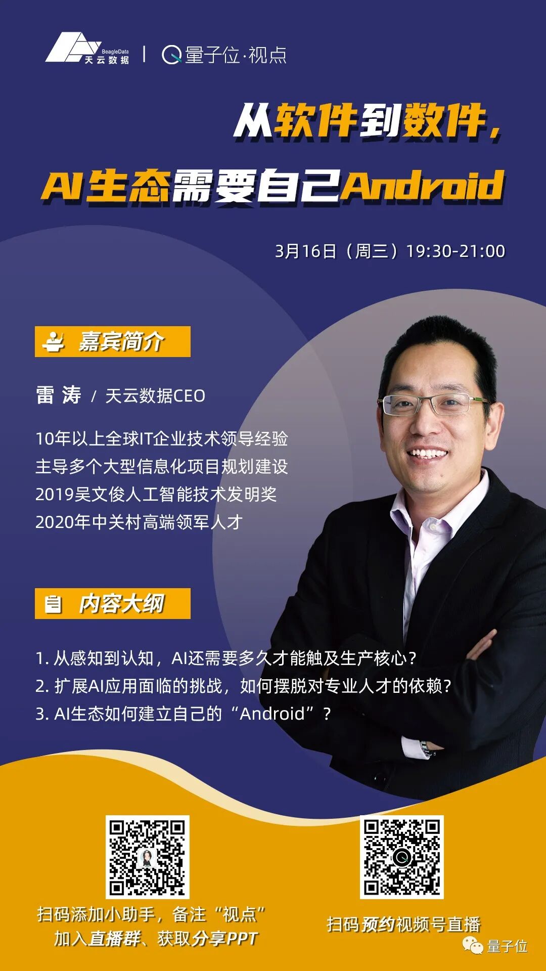 3月16日19:30,「量子位·视点」CEO/CTO系列分享活动将邀请天云数据CEO雷涛直播分享个人见解。扫码预约直播围观吧~