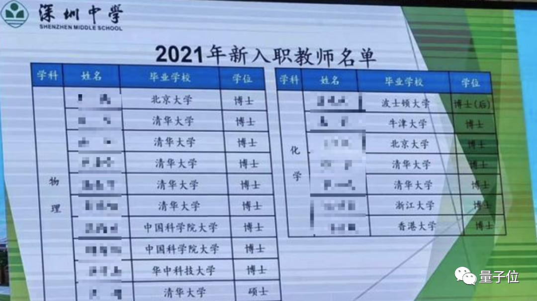 在去年10月份时,一份“深圳中学新入职教师名单”的照片曝光:17人名单中,甚至仅有一人是硕士。