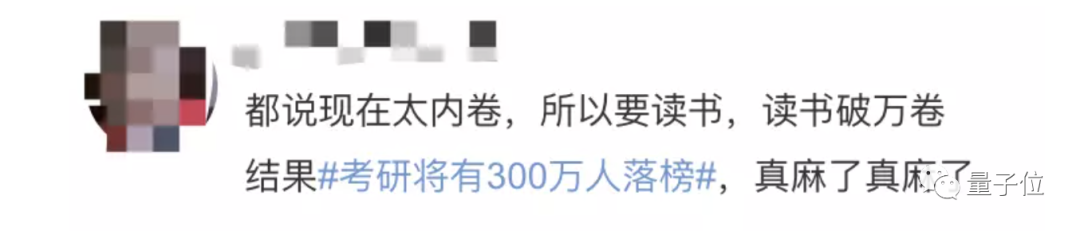 而仅对于今年愈发内卷的考研,有评论认为,大学扩招后很多岗位其实都已经饱和了,所以今年这落榜的300万人中,肯定有不少是为了逃避就业的压力。