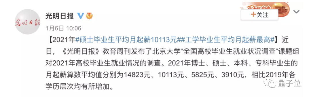 光明日报在今年年初发布了一份“全国高校毕业生就业状况调查”结果,报告中显示:2021年博士、硕士、本科、专科的月起薪算数平均值分别为14823元、10113元、5825元、3910元。