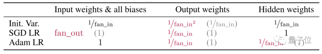 其中粉色文本为µP,括号中的灰色文本为pytorch默认值。