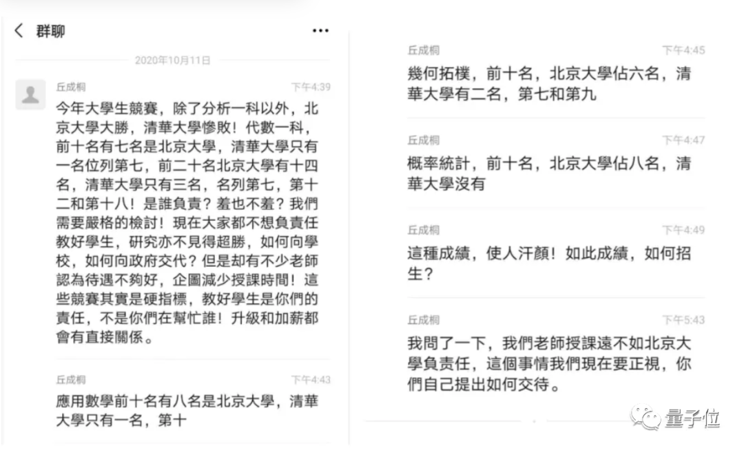 当时,从网传的聊天截图来看,丘成桐的痛批中直接出现了“羞也不羞?”、”严格检讨!“、“令人汗颜!”、“如何交代?”等字眼,措辞极其严厉。