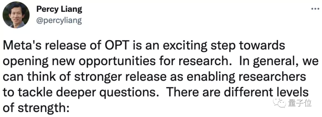 斯坦福大学基础模型研究中心主任、副教授Percy Liang对此发表了观点,将大模型的开放程度总结成4个层次,更高层次的开放能让研究者专注于更深的问题。