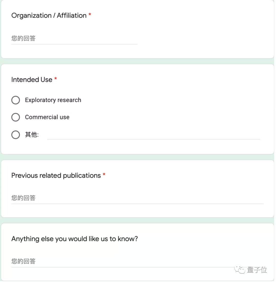 只有完整的1750亿版需要额外填写一张申请表,包括工作单位、用途、相关发表工作等问题。