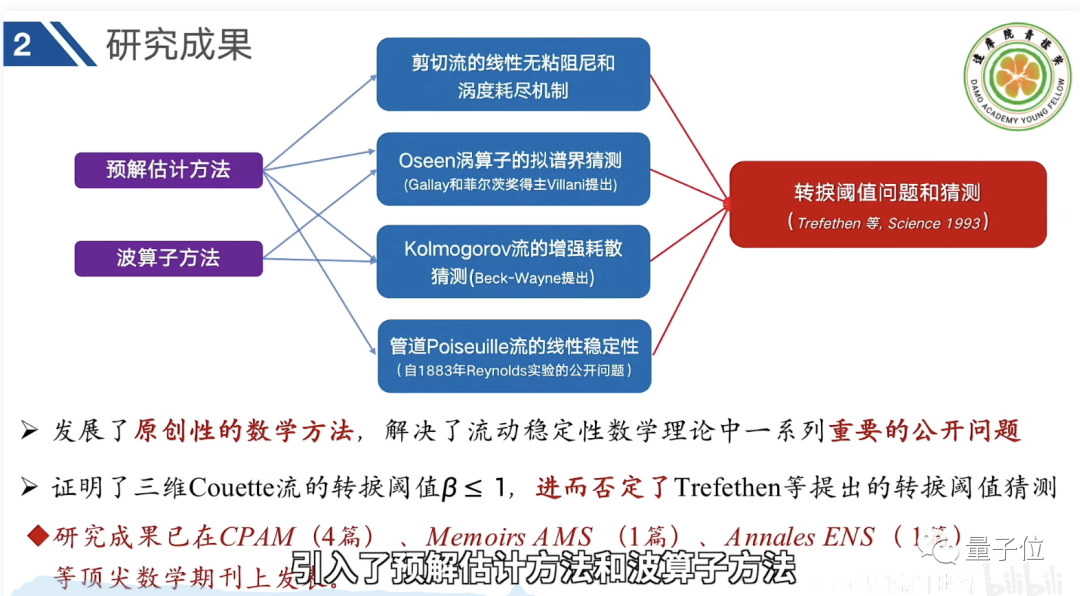 目前,他的主要研究成果,集中在解决湍流问题、流动稳定性、随机矩阵领域中一系列重要的公开问题,以及波动方程中的一些经典问题。