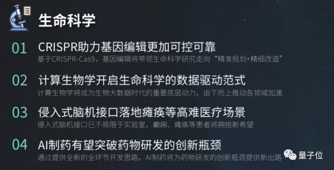 此前量子位智库发布的“2021十大前沿科技趋势”中,与生物相关的技术突破就占据了接近一半: