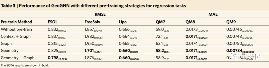 可以看到,在回归数据集上的结果比分类数据集上的改进更大。团队猜测,因为回归数据集的重点是预测量子化学和物理化学特性,而这与分子几何结构高度相关。