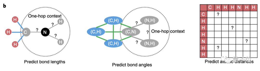 局部结构的,就随机挑选某个原子中心(图中的N)的子图进行遮盖,预测化学键的键长和之间的键角。