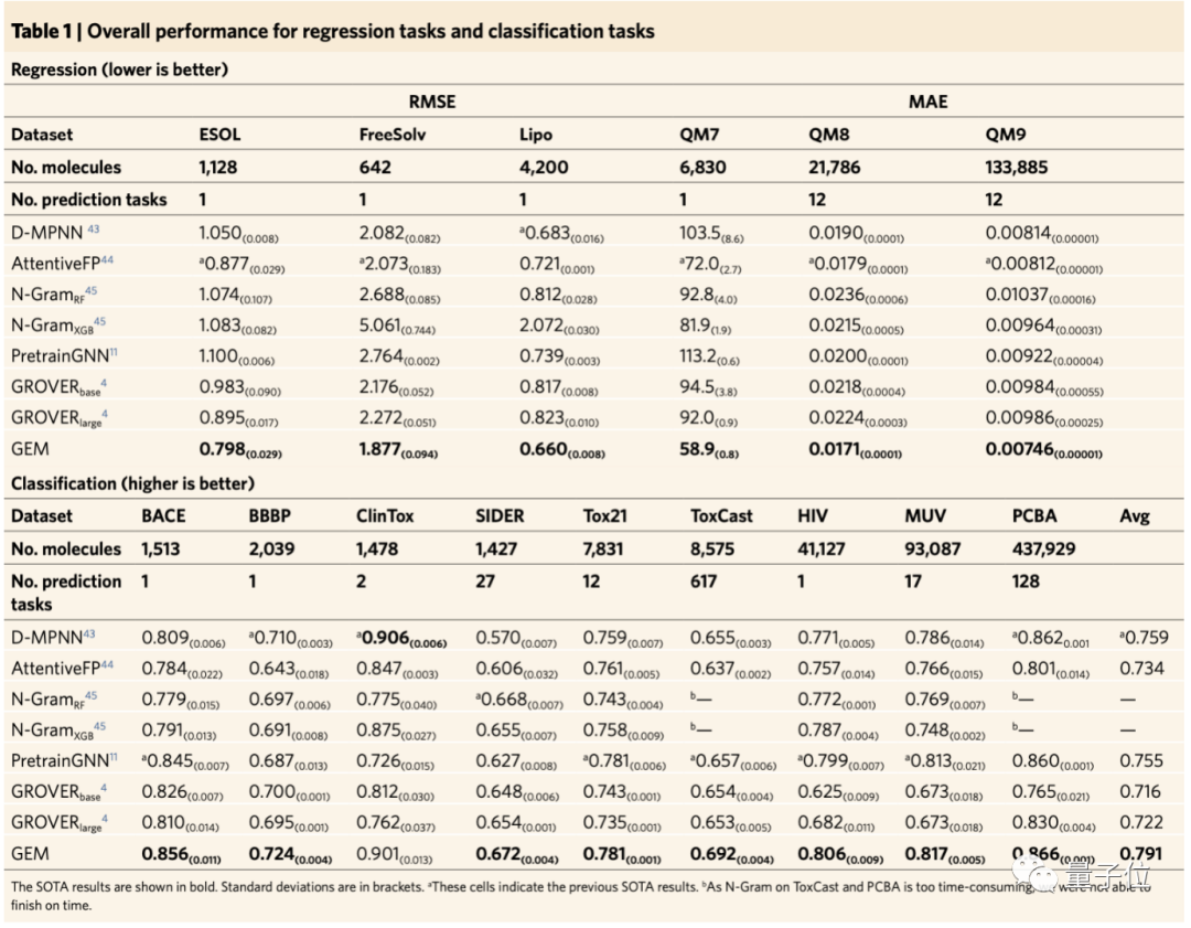最终结果显示,在当前公认化合物性质预测数据集MoleculeNet21的15个基准数据集中,与现有方法比较,得到了14个SOTA结果。