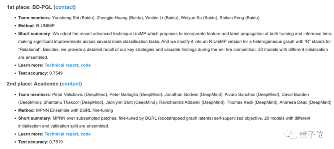 在同一赛事的另外两场图神经网络比赛,节点分类和图关系预测中,螺旋桨生物计算平台背后的百度飞桨框架,又接连取得了2个冠军,同样超越了DeepMind等团队。