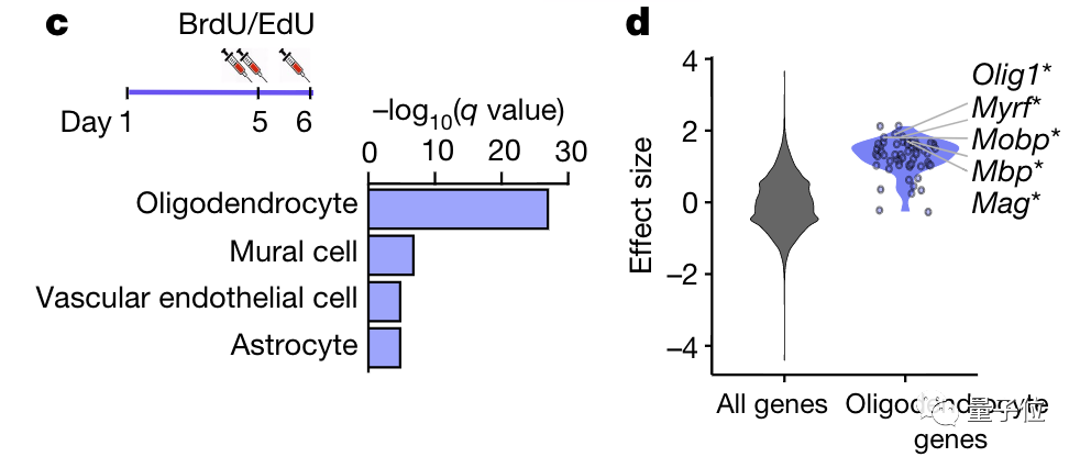 结果发现,在注射年轻脑脊液6天后,老年小鼠海马体中的少突胶质细胞 (Oligodendrocyte)基因表达明显增加。