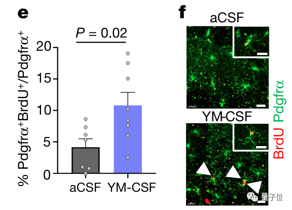 △OPC定量分析及实验图片(f中箭头所指为增殖的OPC)