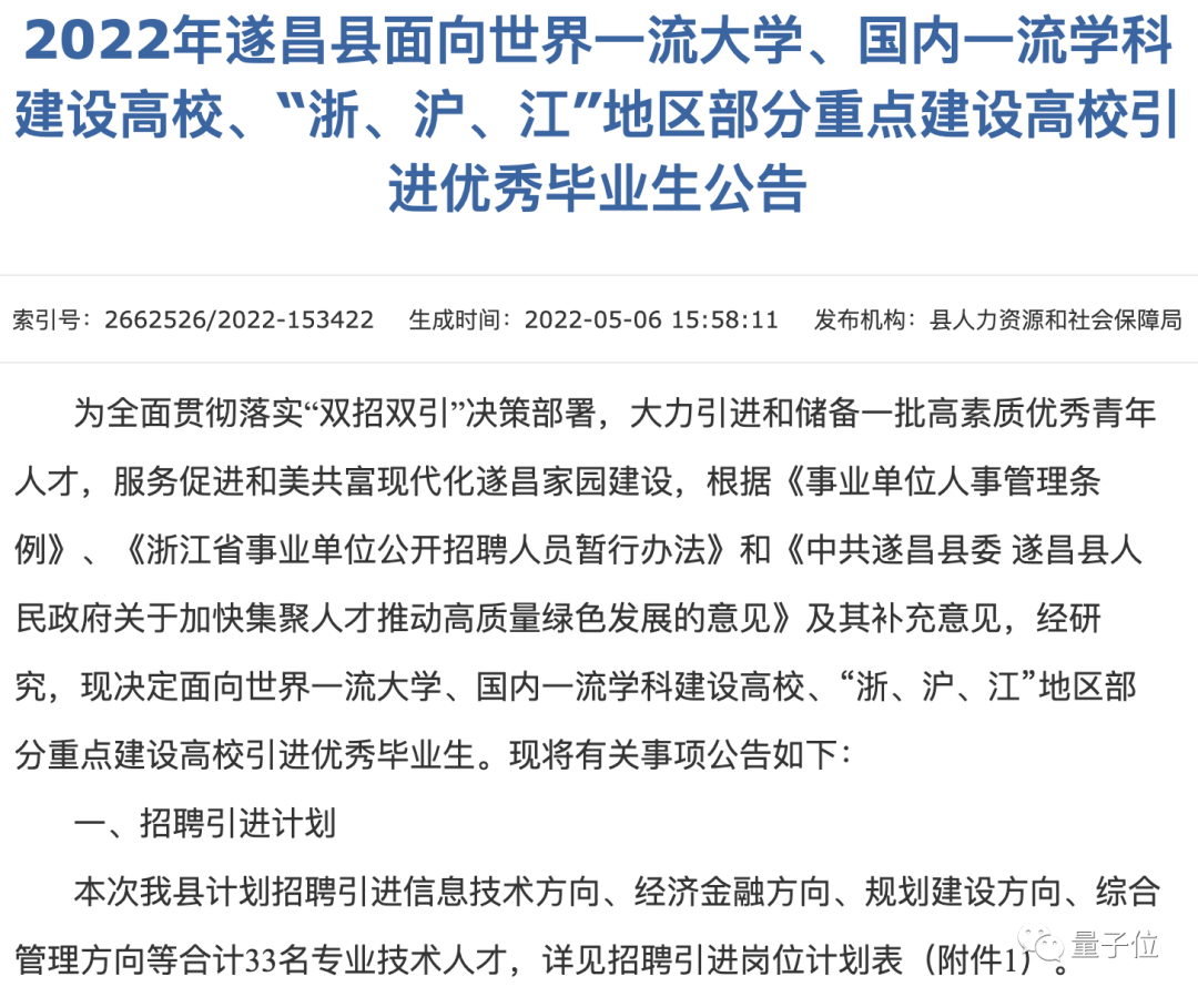 以浙江省遂昌县为例,在引进优秀大学生公告中,就明确提及了毕业于“世界一流大学”的学历要求。