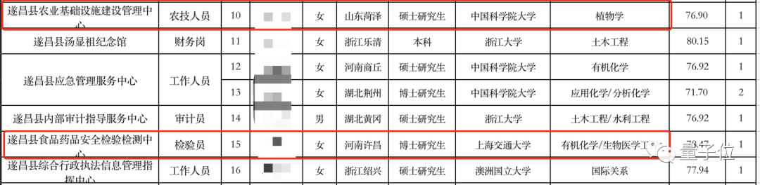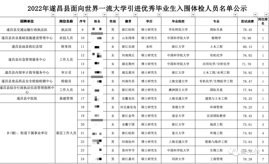 一份2022年遂昌县引进人才入围体检人员名单显示,24个基层岗位吸引了4名博士和19名硕士,其中不乏上交、复旦、浙大这样的周边名校。