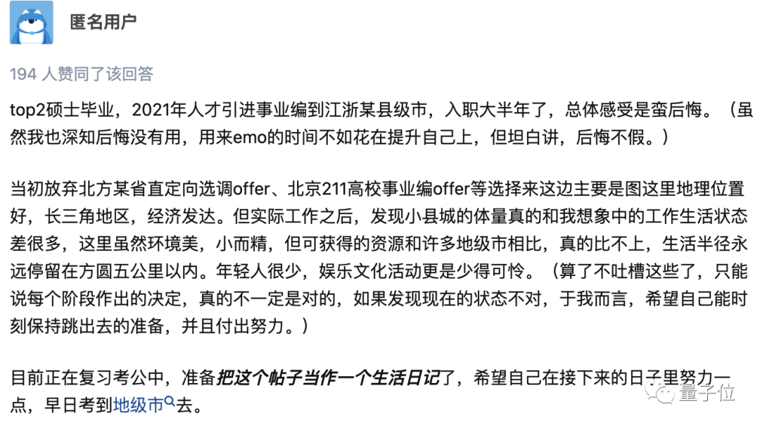 还有人提到,县城生活并不如自己预期中的美好,入职后的整体感受是“蛮后悔”。