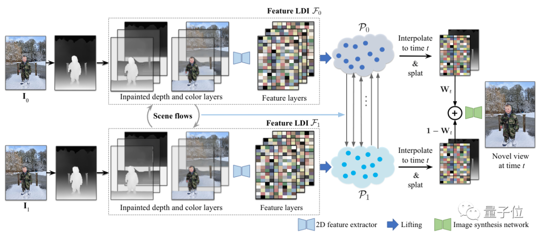 方法的关键在于将2张图片转换为一对基于特征的分层深度图像 (LDI),并通过场景流进行增强。