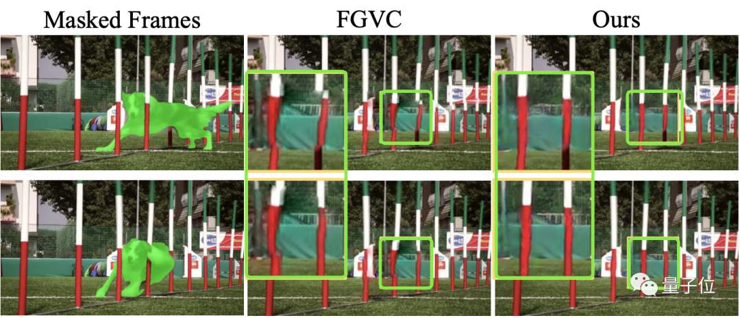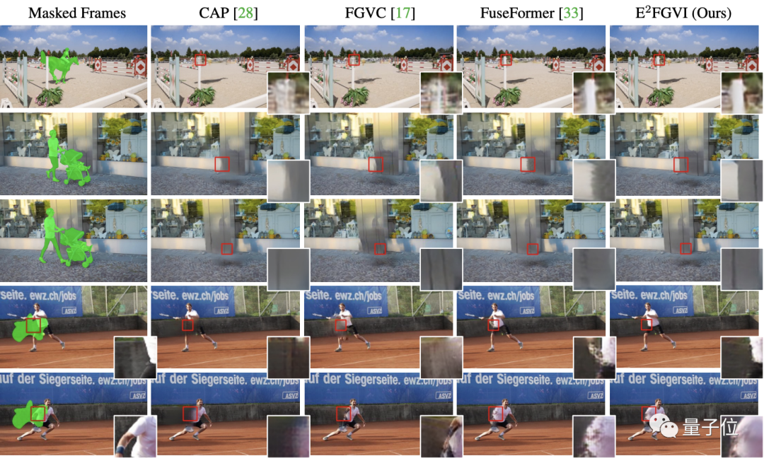 研究人员首先选择了三种最有代表性的方法,包括CAP、FGVC(基于光流法)和Fuseformer(入选ICCV 2021),进行对象移除(下图前三行)和缺失补全(下图后两行)的效果比较。