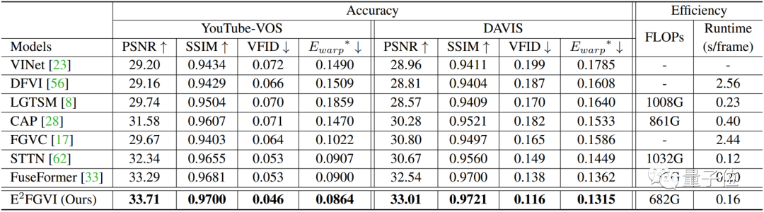 研究人员在数据集YouTube VOS和DAVIS上进行了定量实验,将他们的方法与之前的视频修复方法进行了比较。