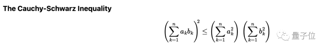 $$\left( \sum{k=1}^n a_k b_k \right)^2 \leq \left( \sum{k=1}^n ak^2 \right) \left( \sum{k=1}^n b_k^2 \right)$$