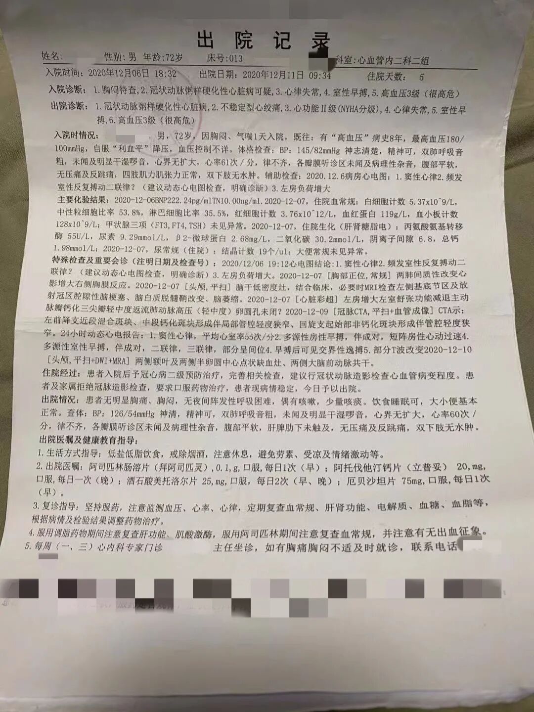 男,年龄72岁,因胸闷心慌入院检查,诊断为:冠状动脉粥样硬化性心脏病,不稳定型心绞痛,心律失常,室性早搏,高血压3级(检查报告如下图)。医院给出的治疗方案是,搭桥,宜早不宜迟。