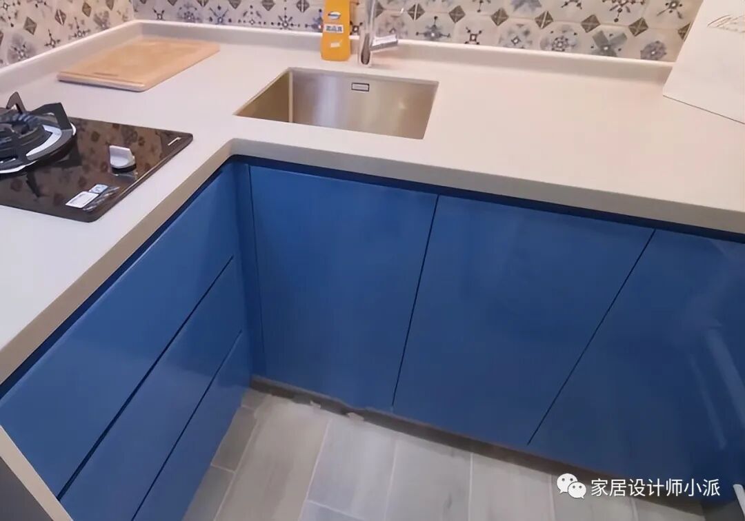 厨房还算宽敞,特意做了蓝色的L型橱柜。蓝色无把手设计的橱柜,从色彩上占尽了先机,让厨房看起来格外宽敞。