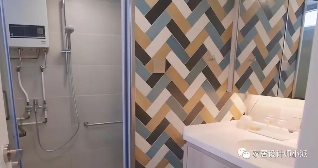 卫生间,特意用花色的墙面做了隔断,做成了干湿分离。这样,就能防止洗浴时水花乱溅,也算是保护隐私和浴室用品的一种方式。