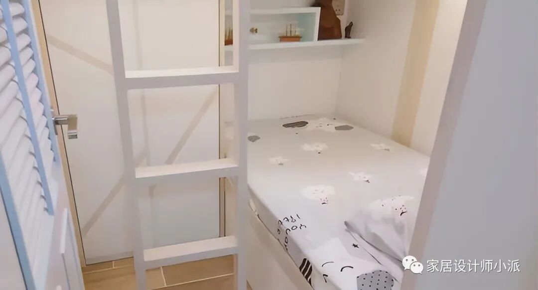 老公睡上铺,女业主和二宝睡在下铺,这样更安全一些。依旧是榻榻米设计,坚决不浪费这寸土寸金的面积。