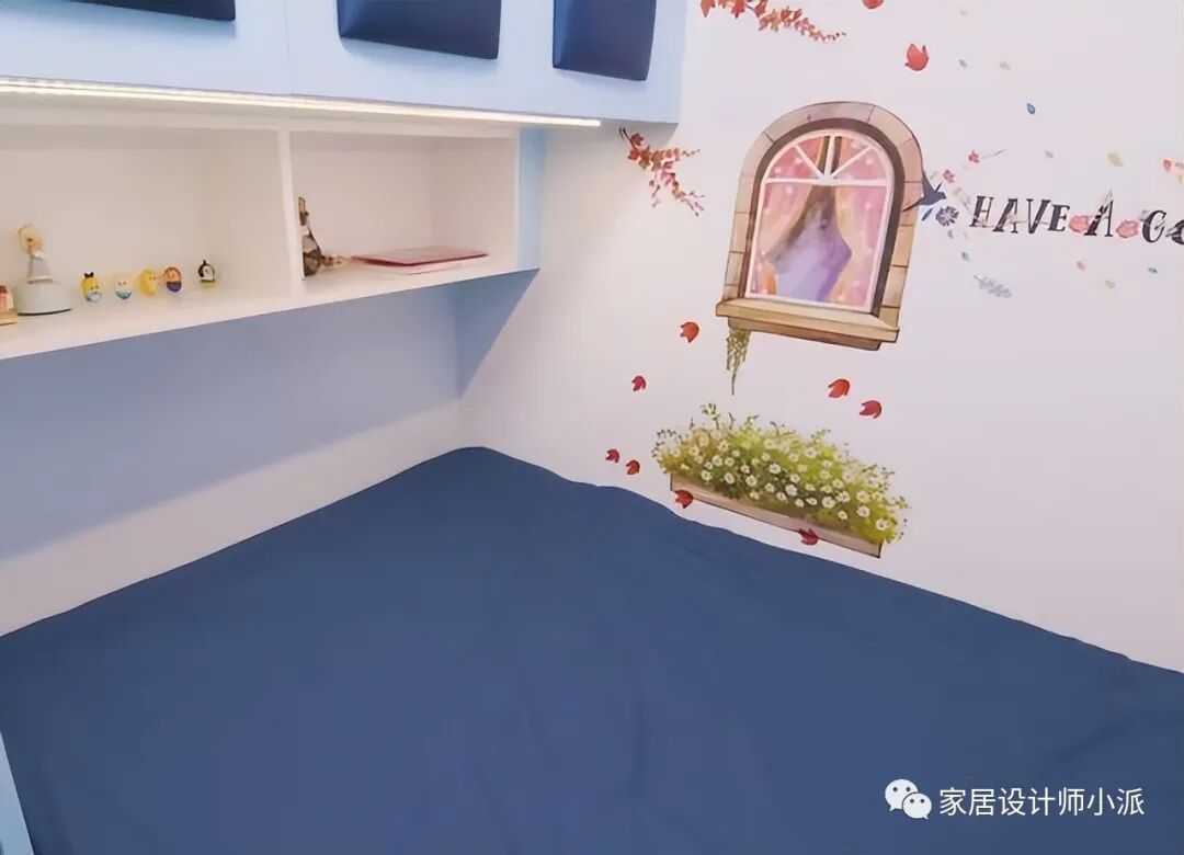 儿童房,和所有的小户型一样,靠墙做了榻榻米。如此一来,就能满足生活和储物的多种需求。整个儿童房的装修,采用了淡淡的蓝色和白色,特别温馨。