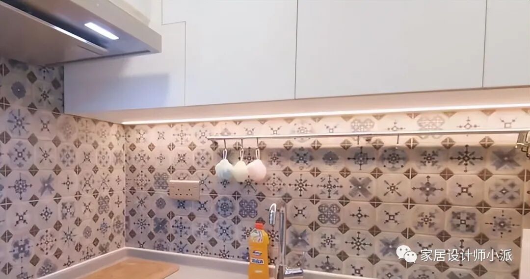 特意做了花色的墙砖,白色的吊柜镶嵌了隐形的灯带。厨房,是烟火气最浓的地方,只有用心设计,才能在做饭的时候,觉得这是一种享受。