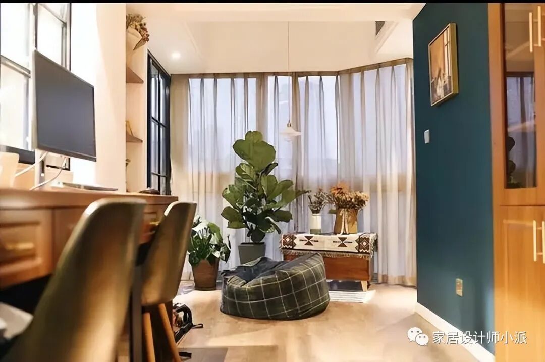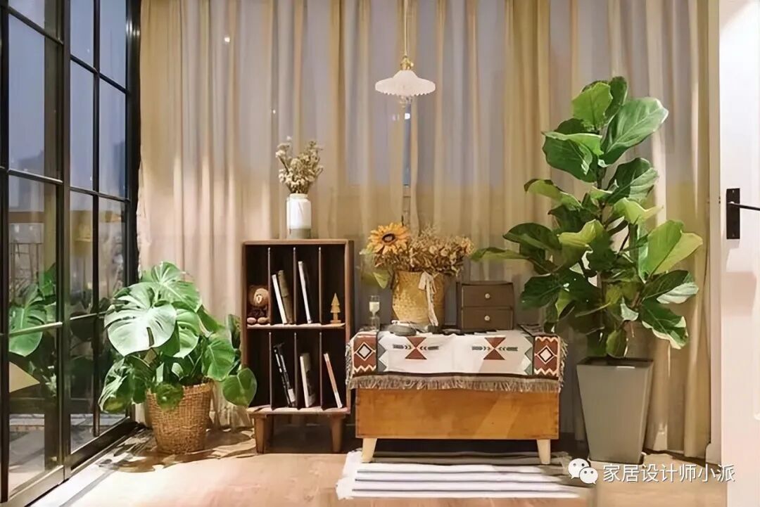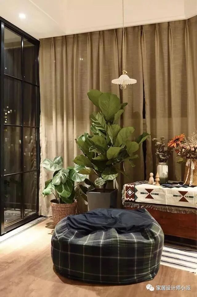 大叶绿植,精致吊灯,深色矮柜及干花装饰,复古的基调中,给人一种安宁的心境。捧着自己喜欢的书,坐在懒人沙发上,待上一天也不觉得疲倦。