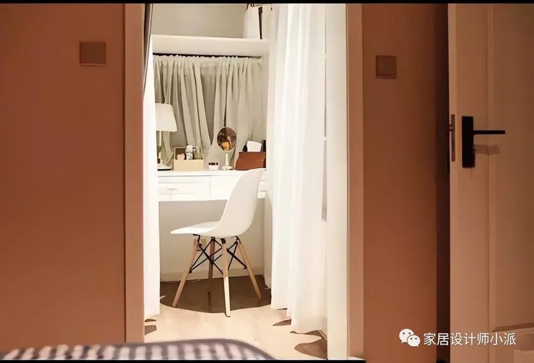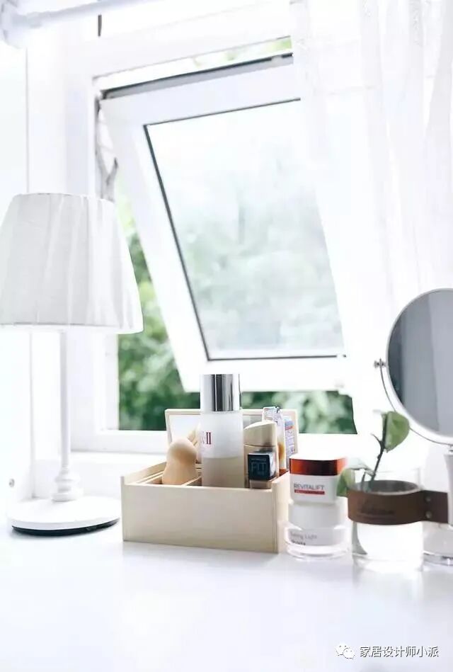 窗前设计了化妆桌,台面上摆放着各类化妆品和工具,窗户带来出色的采光,白天借着自然光化妆,看着更加自然清楚,妆容也会更加美丽动人。