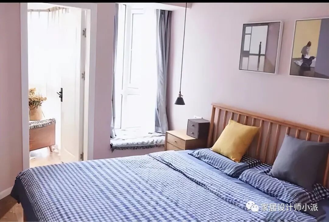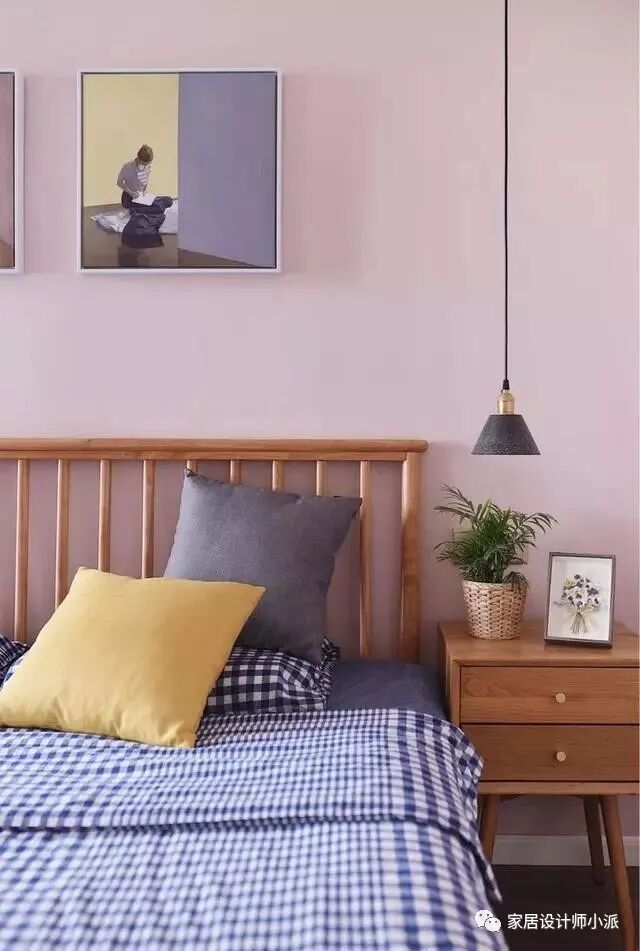床头柜是简单造型的原木材质,上面摆放着绿植与相框,吊灯垂在绿植上,背景是粉色的墙壁,凸显出一抹浪漫的基调,看着卧室一角,顿觉生活是多么美好。