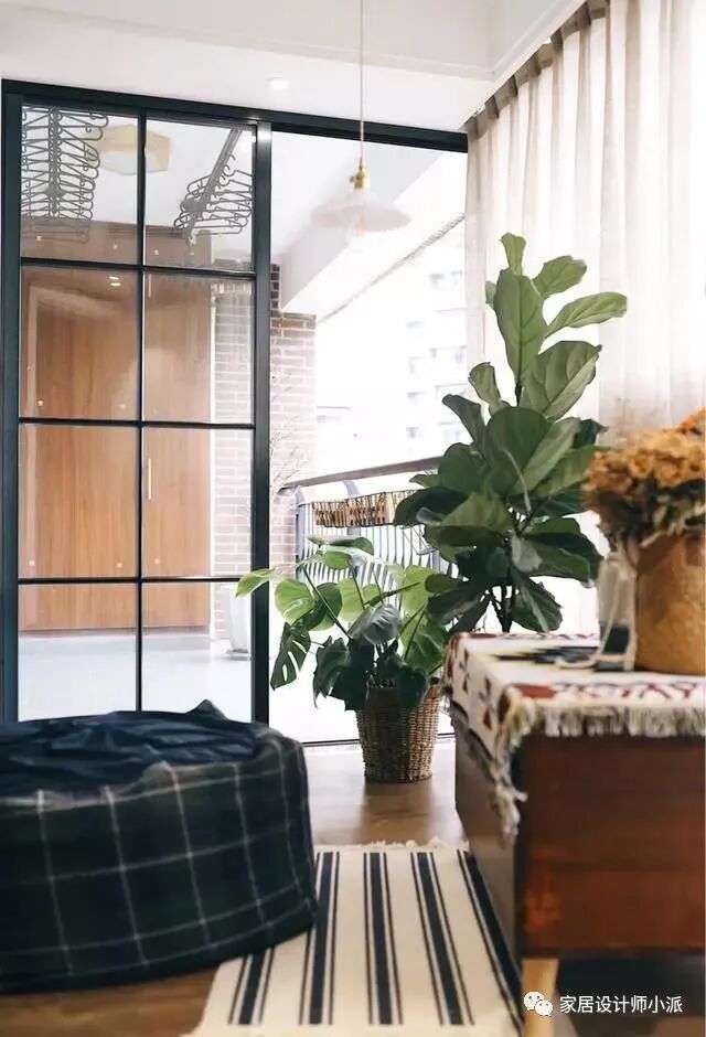 户型不算大,如果仅以单种功能来定位阳台的话,那么无疑是很浪费的。屋主巧妙地利用玻璃门进行隔断,一边是休闲区,一边则用来晾衣服。