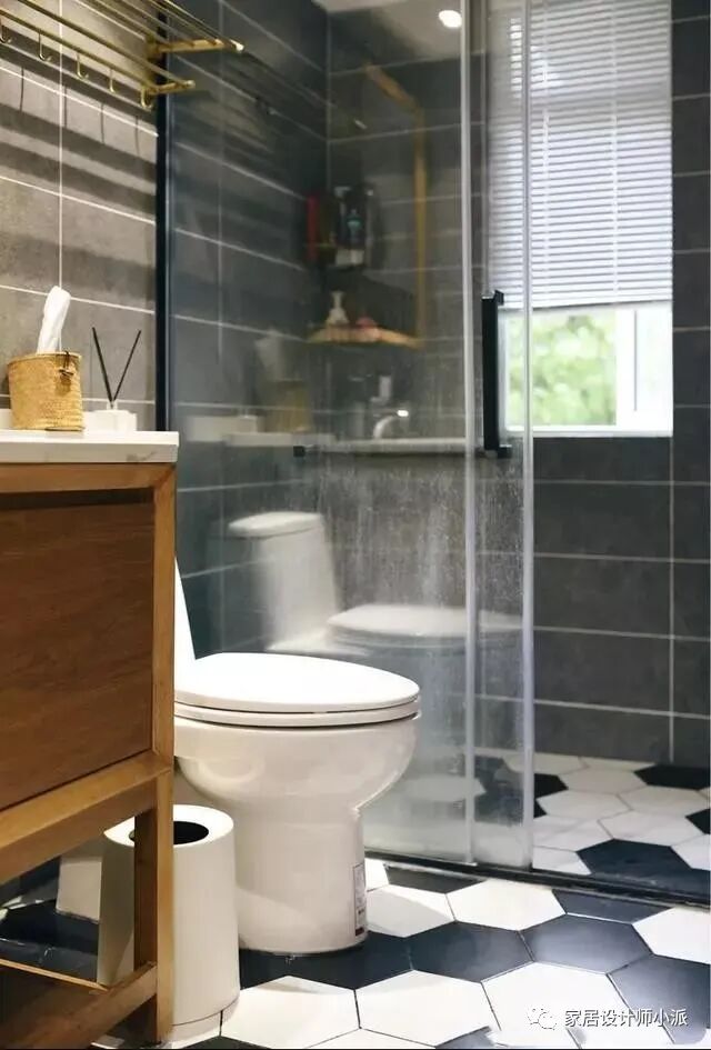卫生间利用淋浴屏风做了干湿分离设计,避免洗澡时水汽喷溅到干区。地面铺设六角砖,黑白相间就像踩在足球场上。【本期总结】