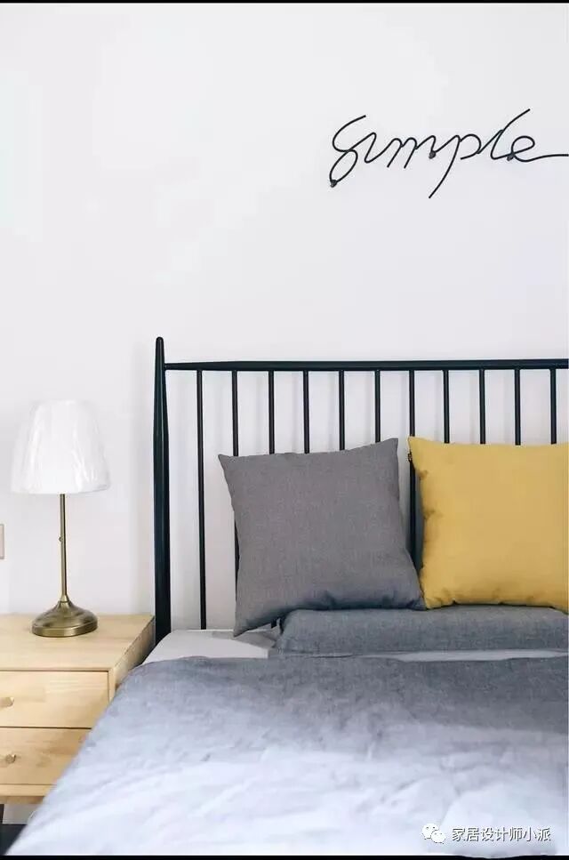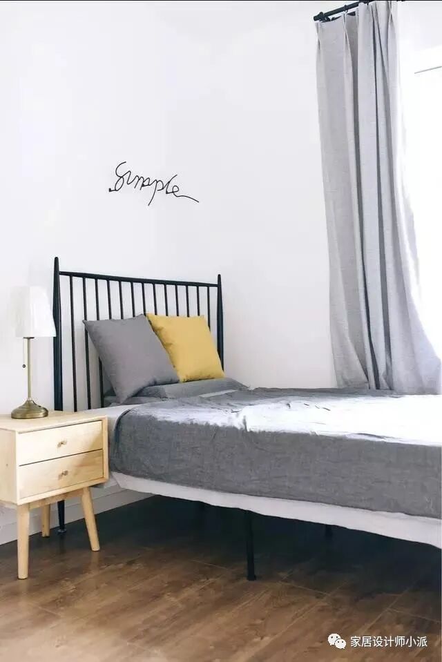 次卧的布置不同于客餐厅,也不同于主卧,更加简单,北欧工业风设计,铁质床铺工业风满满,灰色的床单和窗帘搭配十分和谐。