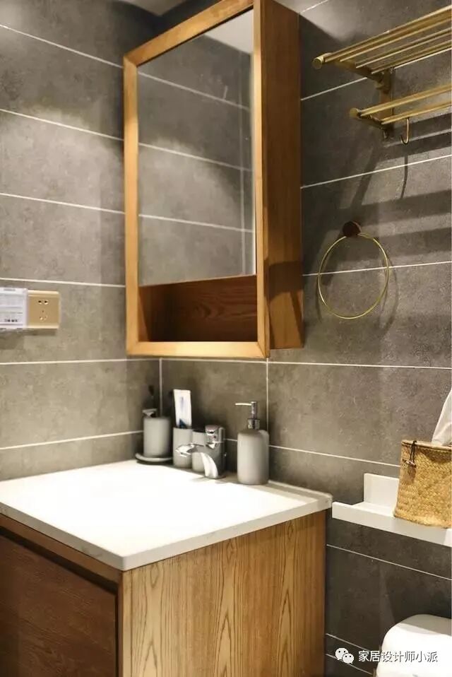 卫生间面积不大,屋主选用了一个比较窄的浴室柜。卫生间铺贴的是深灰墙砖,搭配原木色浴室柜和白色洗手台,再加上黄铜材质的五金件,简约耐看。