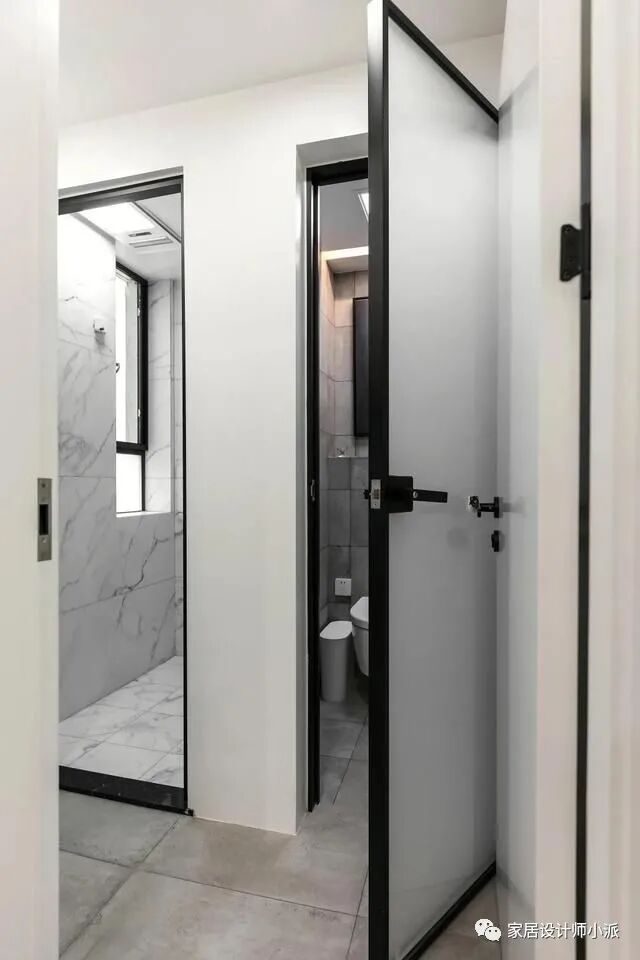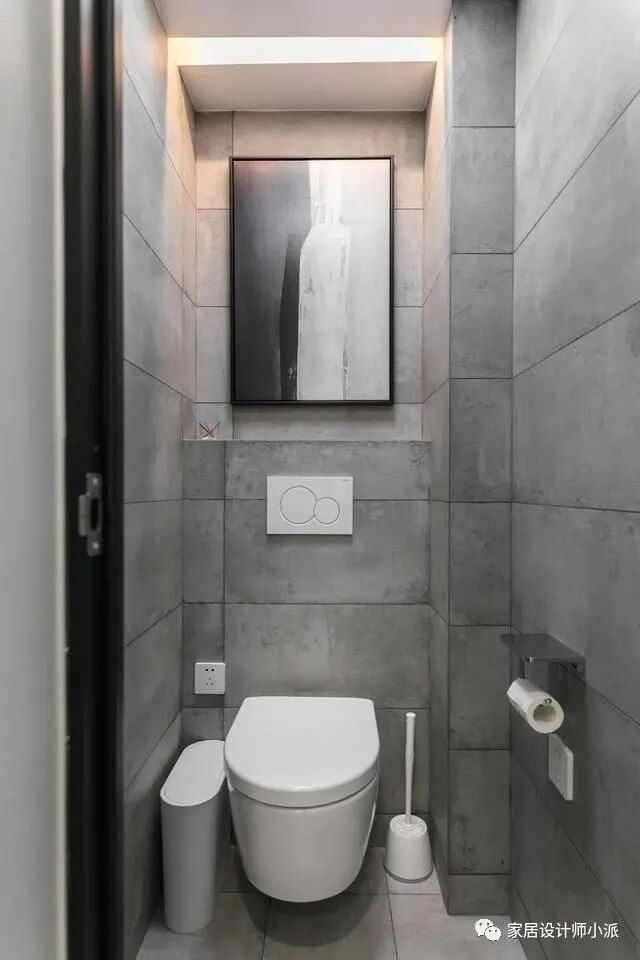 马桶区做了大理石防水砖全铺,浅灰色地砖搭配上壁挂马桶,科技感时尚感爆棚。隐藏水箱的设计,结合悬空马桶,减少卫生死角。