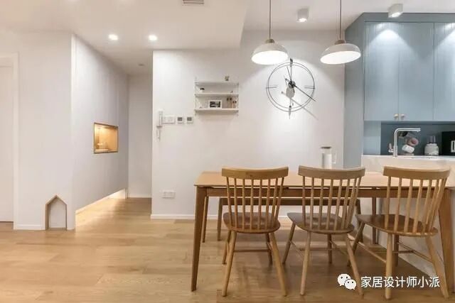 餐厅吊平顶使用简约吊灯,简洁美观,而且还方便打理。墙上的钟,也是整个空间亮点。