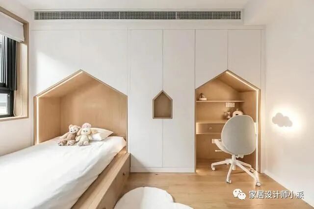 既丰富了卧室背景墙的层次感,也美化了空间。镂空小房子贴上一圈灯带,简直就是孩子们的梦中情房。