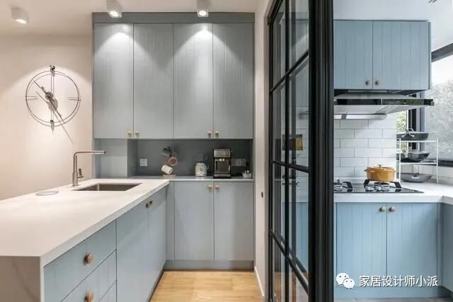 白色和蓝色为底色打造了整个厨房,柜体做了L型的收纳,保证了操作台的长度,做饭区的油烟问题也基于考虑,不仅增添了玻璃门还增添了一体式油烟机。