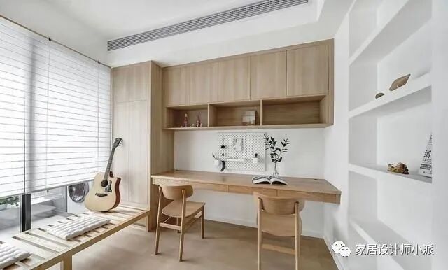 另一个卧室,业主做成了书房,依旧是原木风格,简单大气。白色的卷帘之后,还藏着小小的阳台,是业主的洗衣区,如此隐秘的设计,相信很多人都没有发现。