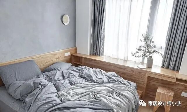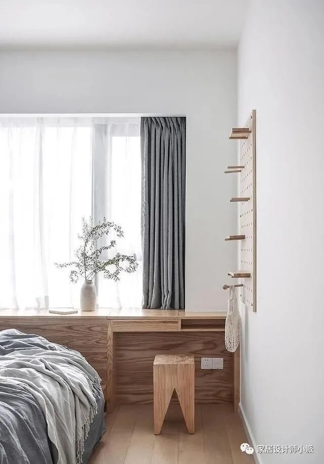 临窗做了一排多功能的柜子,既能简单储物,又能当做梳妆台,使用起来特别方便,最重要的是节省空间。