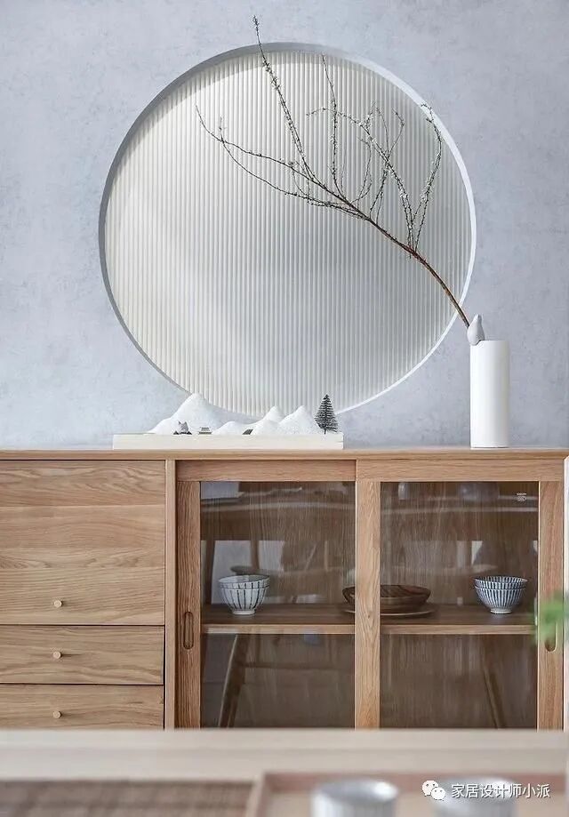 一侧摆放的原木色橱柜是餐厅的最大亮点,背景墙做了传统的园林造型,灰色背景墙和圆形镂空设计。为了应景,还特意做了原木色的隔断,满满的精致感。
