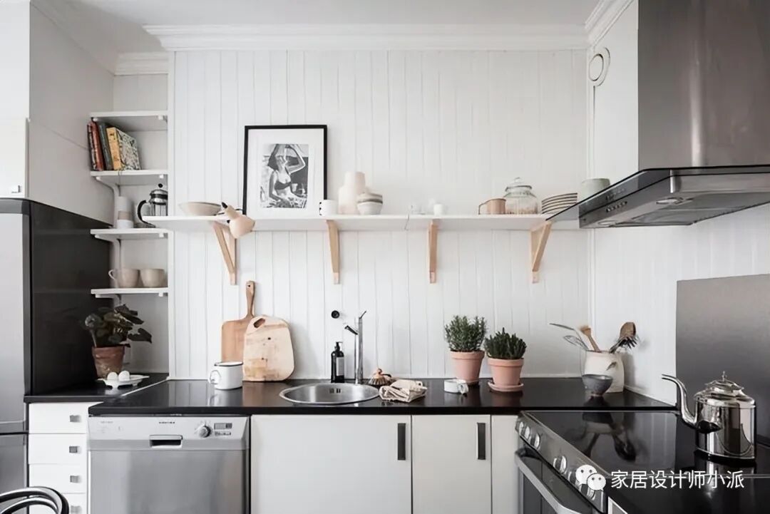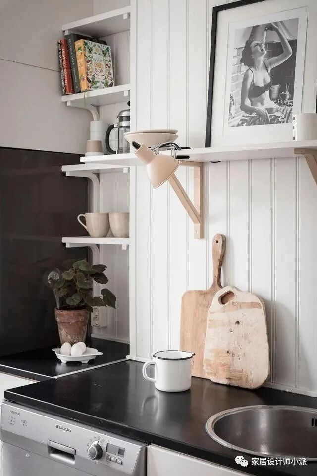 橱柜上方没做吊柜,而是做了开放式隔板,不过一人独居也没那么多东西要收纳,一圈隔板的设计也足够收纳屋主珍藏的一些餐具,开放式设计也更加一目了然,拿取更加方便。