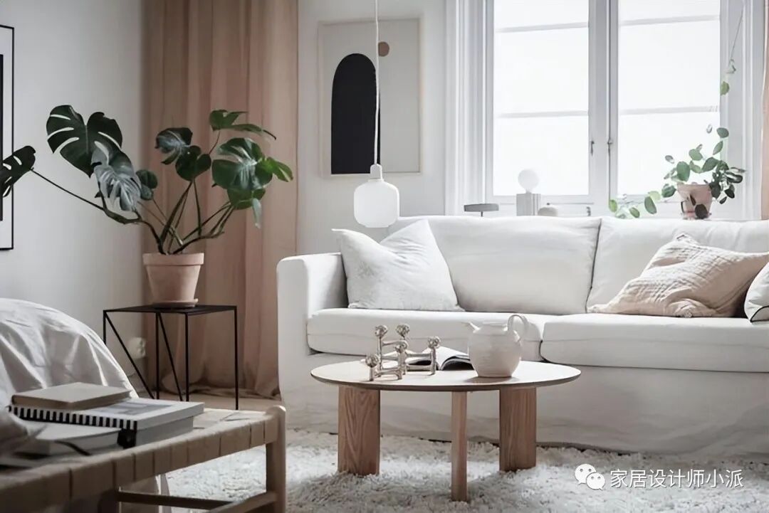 白色双人位沙发,看着就非常柔软舒适,搭配原木轻便小茶几和角落的绿植,整个空间尽显高级浪漫。