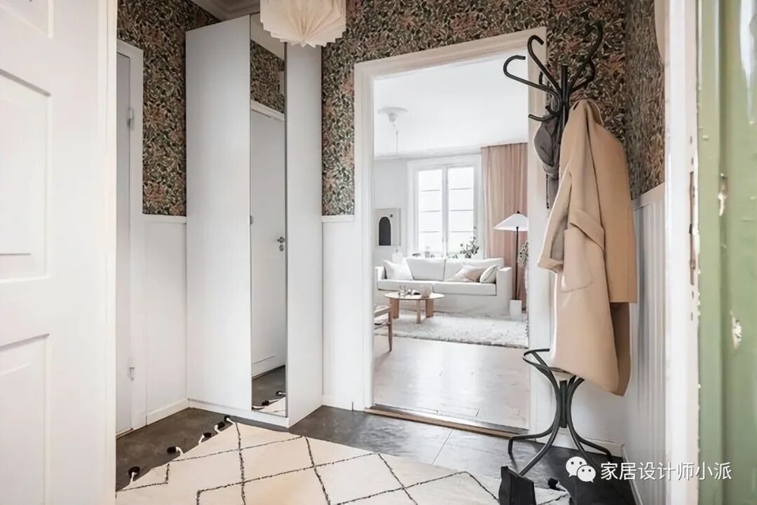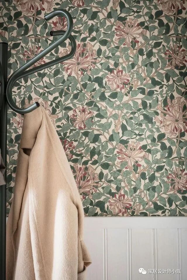 玄关的颜值也是一绝,彩色印花墙纸搭配白色栏栅造型,非常复古的感觉。挂衣钩也是铁艺古典样式,与整体风格非常搭配。