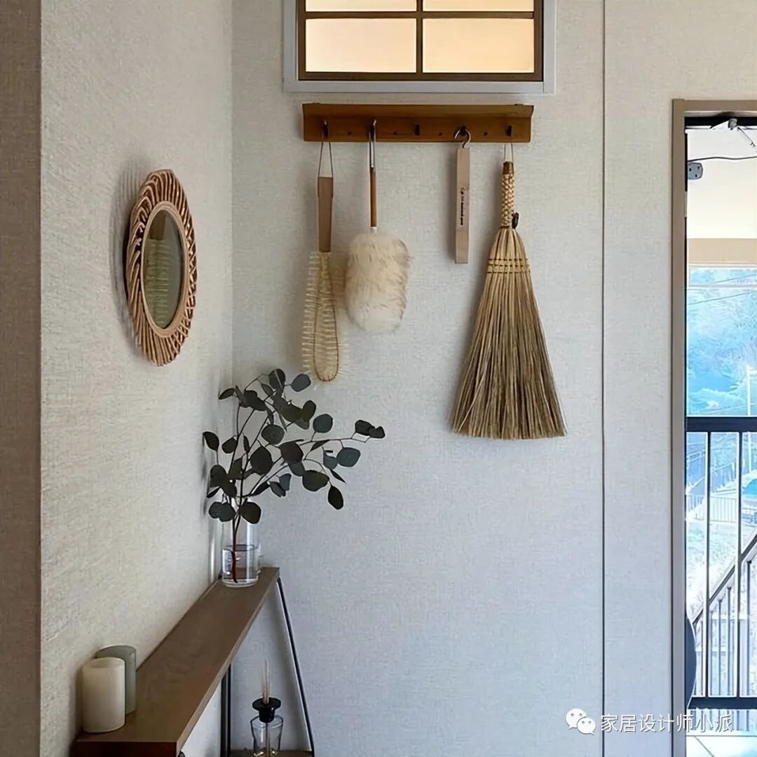 而另一侧的墙面,也安装了原木色的挂钩,各种家用刷子都被整齐地收纳起来,一点都不显凌乱。