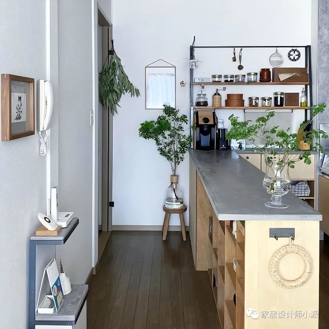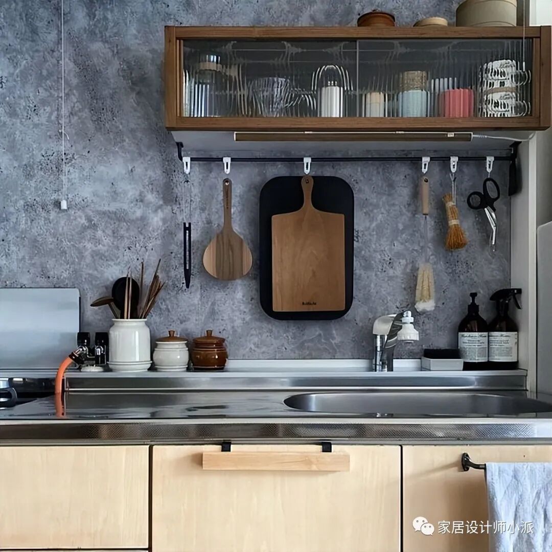 简单的原木色厨房收纳架,把所有的调味料和厨具都收纳起来。如此一来,整个厨房的操作台面都特别整洁,毕竟所有物品都被收纳上墙。
