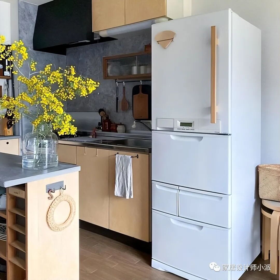 一款白色的冰箱,把餐厅和厨房巧妙地分割。开放式的厨房设计,显得餐厨区更加宽敞,一点都不显压抑。